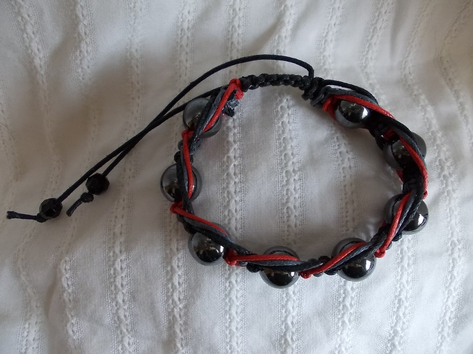 Bransoletka z czarnego, szarego i czerwonego sznurka woskowanego oraz kul hematytu. Szerokość bransoletki ok 13mm, długość regulowana.